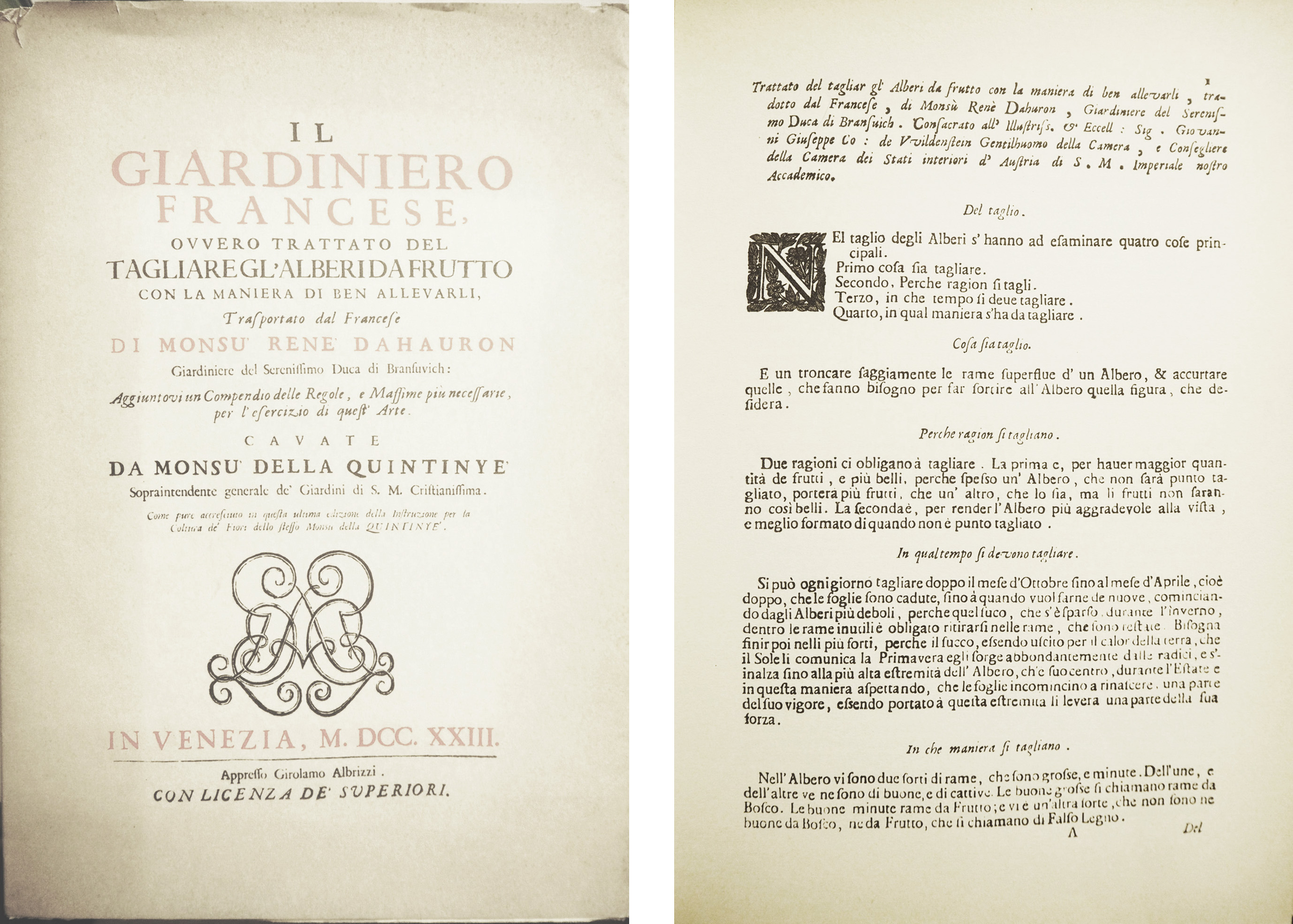 Facendo ordine nella libreria, ieri mi è ricapitata fra le mani la copia anastatica di un piccolo saggio di potatura e giardinaggio datato 1723 che avevo trovato, per caso, anni fa in una libreria sotto casa. Si tratta de “Il Giardiniero Francese”, una sorta di sunto di due scritti, uno francese, l’altro italiano che trattavano di giardinaggio, ed in particolare (il testo francese tradotto) di potatura.