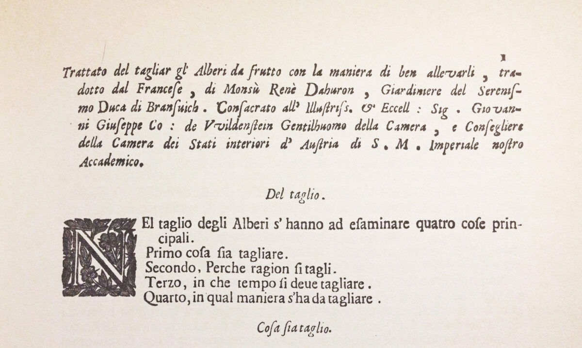 Leggete cosa scrive l’autore nella premessa del suo saggio di potatura tre secoli fa. Elenca quali sono le quattro “cose” che si devono esaminare “nel taglio degli Alberi” … la prima? “cosa sia tagliare” , che sottolinea l’importanza dell’operazione stessa, prima di ogni altra cosa!