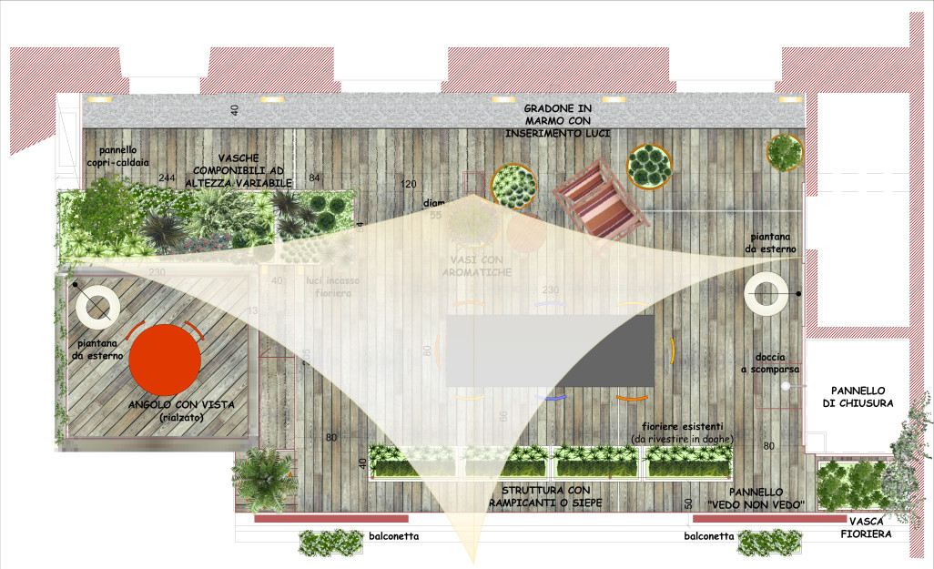 Una terrazza con vista sui tetti, un luogo pieno di fascino nel centro storico della città. Giocando con i livelli, l’abbinamento di materiali nobili e materiali poveri, l’uso di luci che ne rendono piacevole l’uso notturno e la messa a dimora di vegetazione “morbida” ed informale si è cercato di ridare il giusto spirito ad un luogo d’affezione rendendolo unico e speciale.